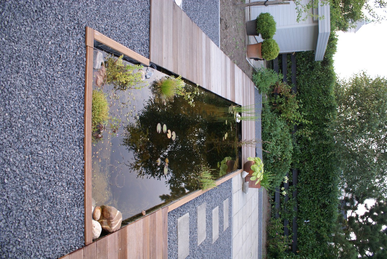 Totale tuinaanleg met vijver, split, houten vlonders en bestrating